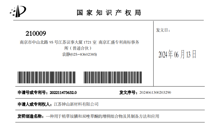 金浦集團(tuán)旗下企業(yè)——江蘇鐘山新材料有限公司,近日一發(fā)明專利《一種用于精草銨膦和雙唑草酮的增稠組合物及其制備方法和應(yīng)用》喜獲國家知識(shí)產(chǎn)權(quán)局授權(quán),專利號(hào)CN202211473632.0,該組合物能夠顯著提高除草劑的粘度,減少藥劑流失,增加使用效果,并且降低精草銨膦和雙唑草酮的使用量。